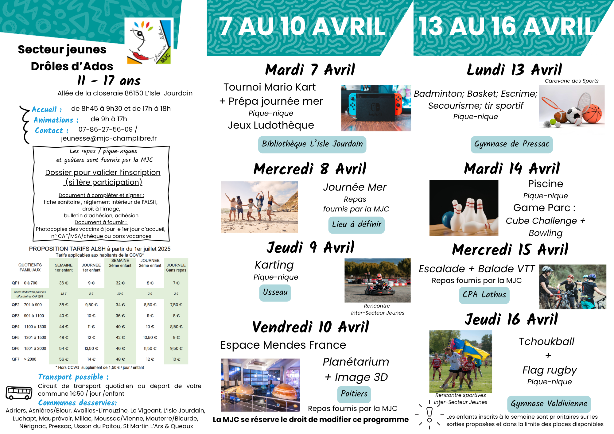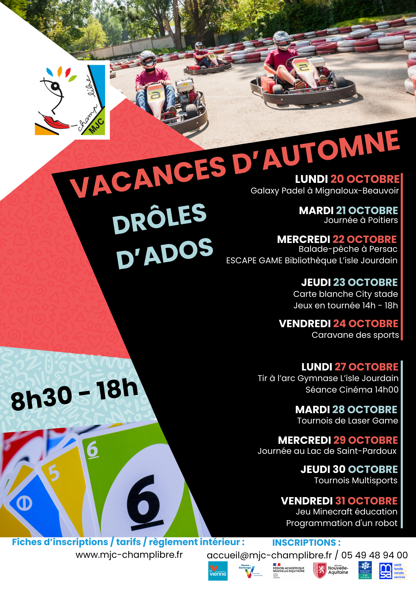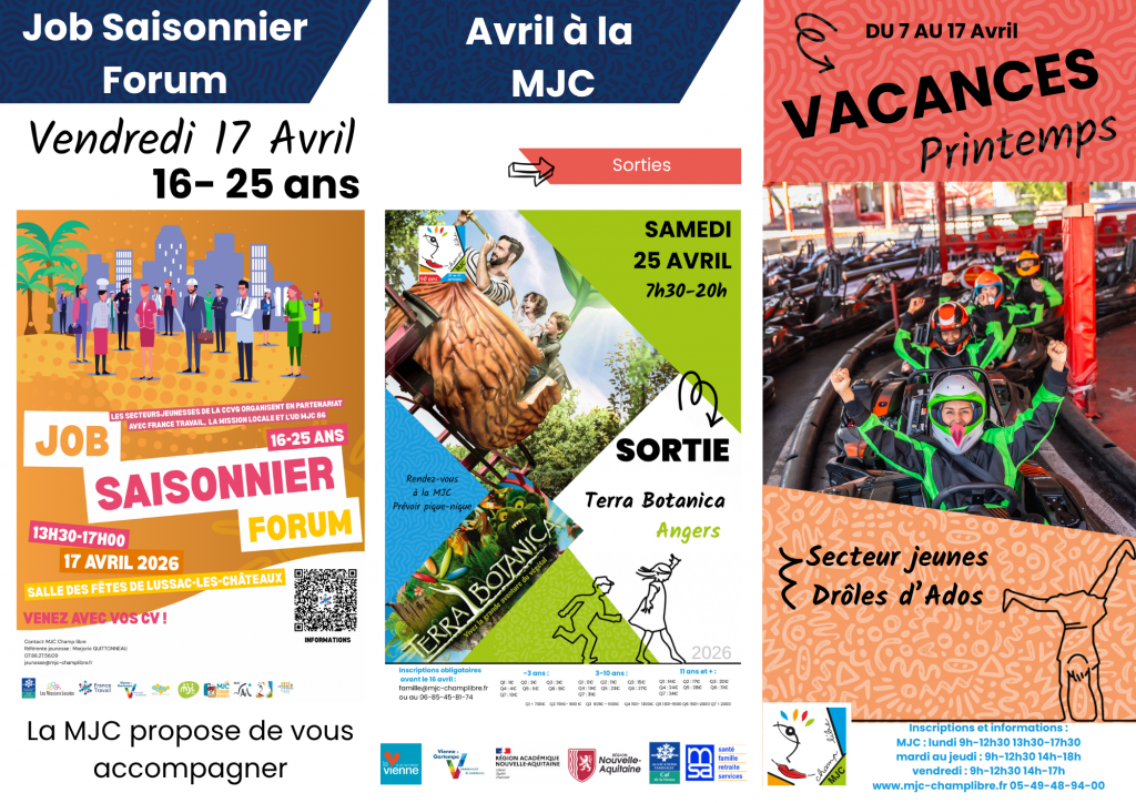 Pour chaque heure d’accueil de votre enfant, les communes Adriers, Availles Limouzine, L’Isle Jourdain, Le Vigeant, Luchapt, Mauprévoir, Millac, Moussac/Vienne, Mouterre/Blourde, Nérignac, Queaux, Saint Martin l’Ars, Usson du Poitou, la Communauté de Communes Vienne et Gartempe, le Service Départemental à la Jeunesse à l’Engagement et aux Sports, la Région Nouvelle Aquitaine, la Mutualité Sociale Agricole Poitou, le Département et la Caf de la Vienne participent au financement de la MJC.